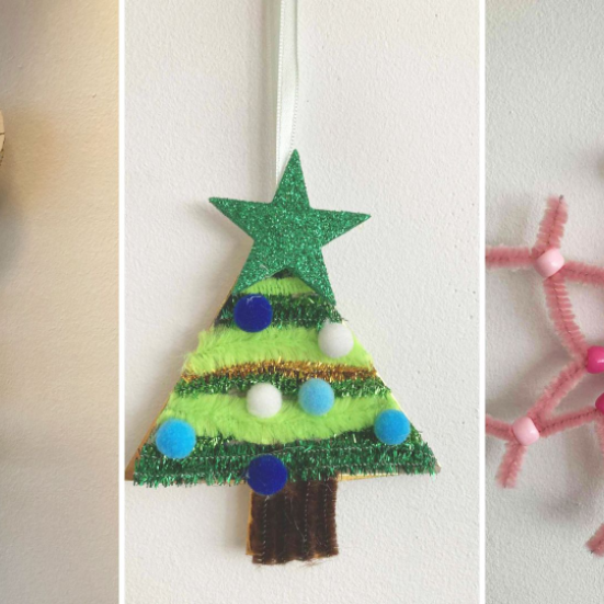 Vi klippe-klistrer julehjerter, guirlander og andet pynt til juletræet.